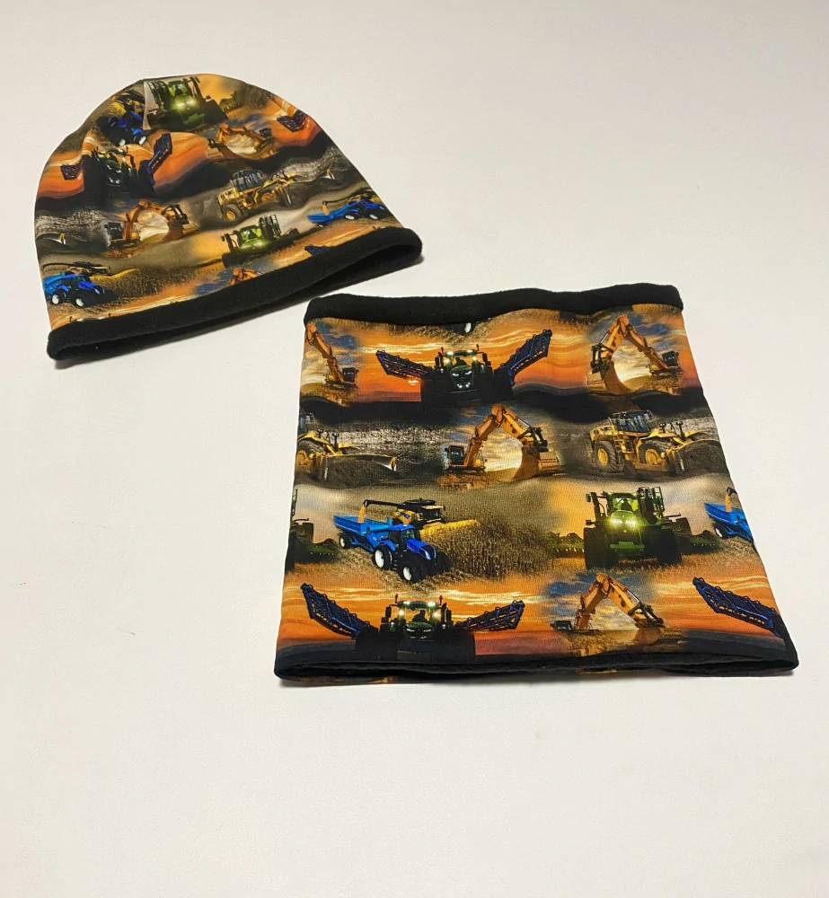 Set čepice a nákrčníku bagry a traktory v západu slunce vel 46Skladem 2 ks300 Kč/ ks248 Kč bez DPH