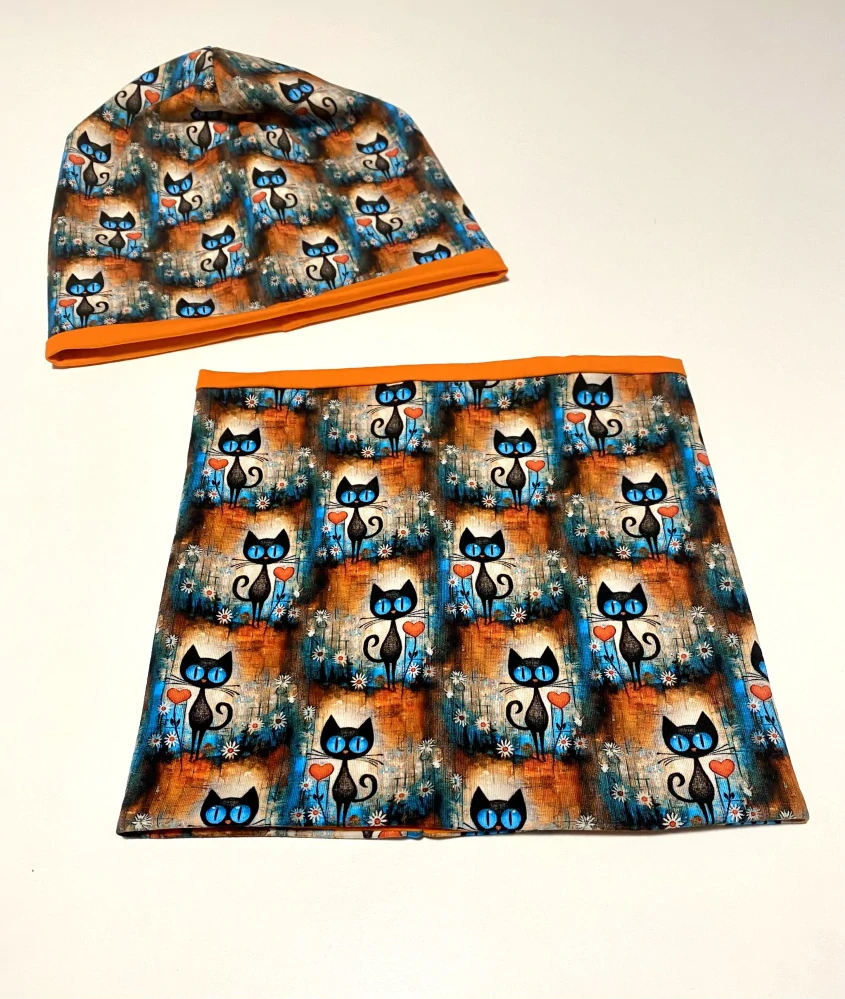 Set čepice a nákrčníku s motivem zamil. kočky, oranžový podklad, vel 50