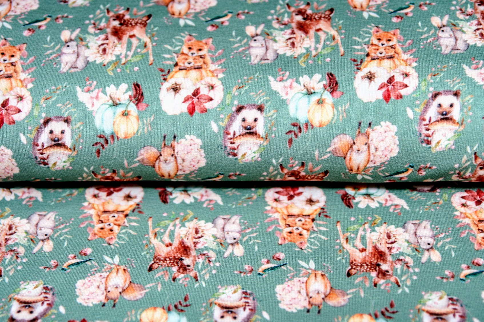 Teplákovina potisk lesní zvířátka liška, koloušek, ježečekSkladem 5.6 bm310 Kč/ bm256 Kč bez DPH
