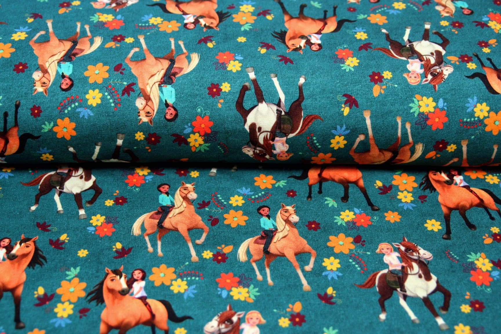 Teplákovina dívčí jezdkyně s květinami na petrolejovéSkladem 4 bm288 Kč/ bm238 Kč bez DPH