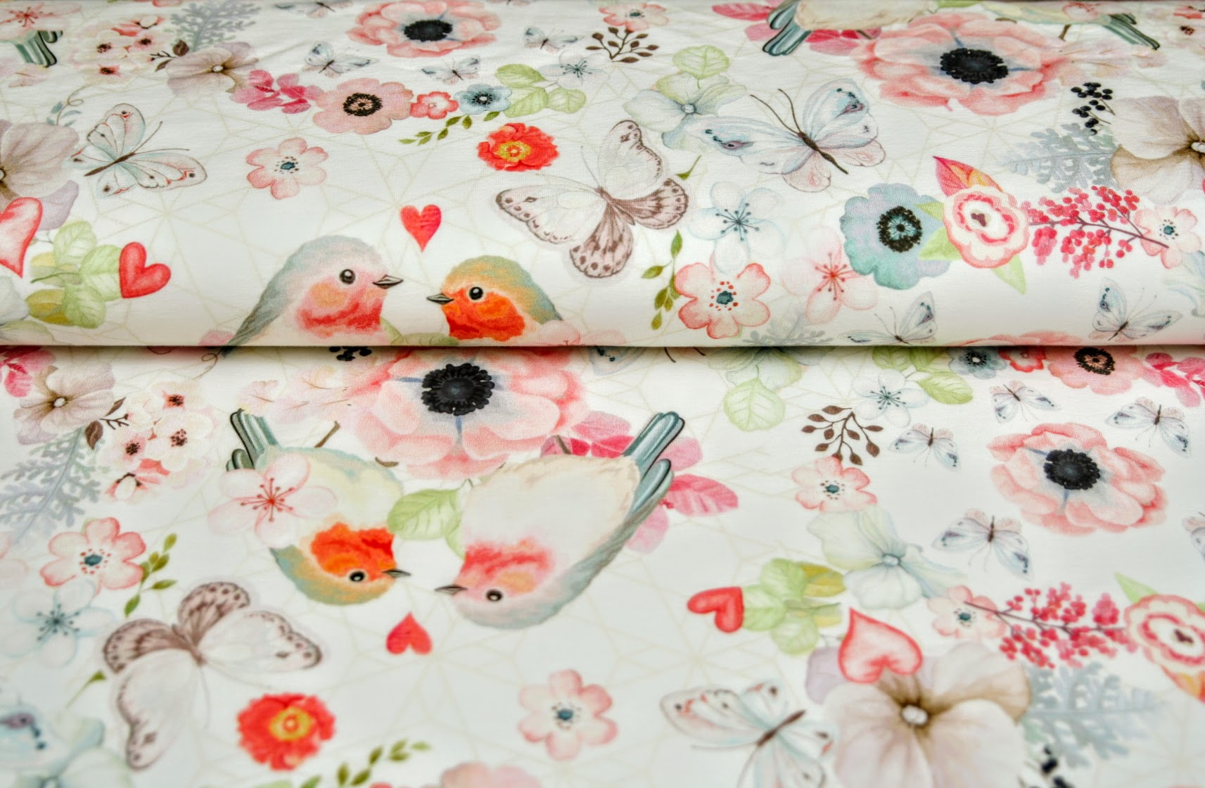 Teplákovina metráž ptáček červenka s růžíčkou na světléSkladem 4.4 bm298 Kč/ bm246 Kč bez DPH