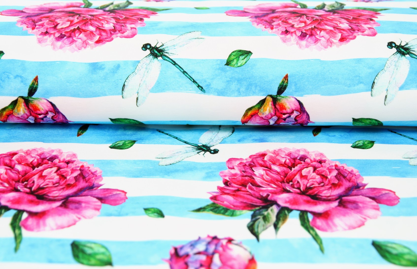 Teplákovina pivoňky na modrých proužkách- ZBYTEKSkladem 0.8 bm200 Kč/ bm165 Kč bez DPH