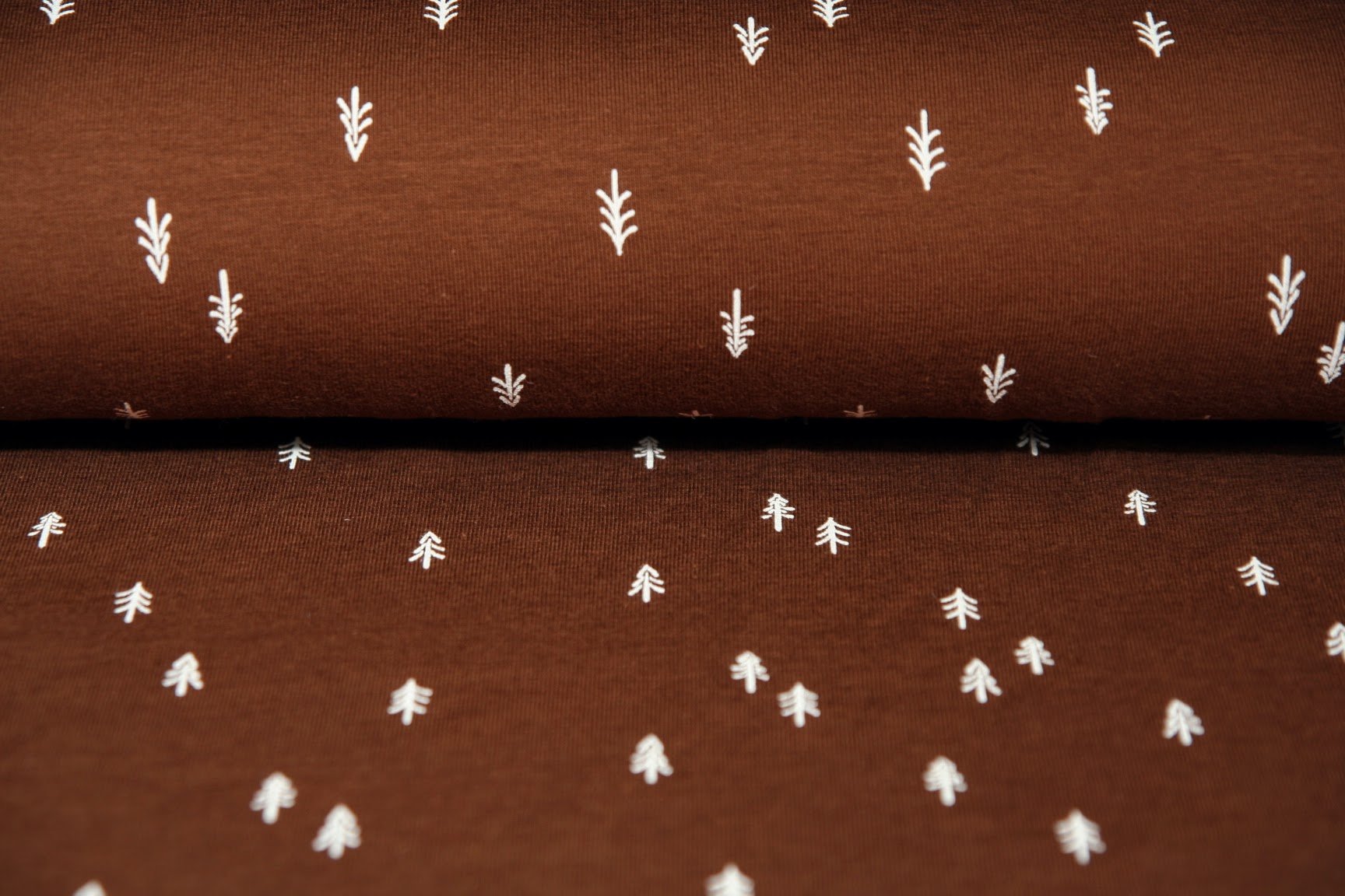 Designový úplet v metráži se stromečky ocení každý, kdo má rád jednoduché, ale zároveň moderní vzory. Úplet je inspirován přírodou a díky jednoduchému designu vzor vynikne jak na šatech, tak třeba na něčem menším, jako je čepice. Podklad je v hnědém odstínu, a díky vzoru z něho můžete tvořit dámskou i pánskou módu. Úplet bude skvělým pomocníkem při tvorbě oblečení jak do města, nebo si ho využijete na tvorbu pohodlného oblečení na doma. Díky uni vzoru jej oceníte pro obšití celé rodiny a s blížícím se svátkem by byl úplet ideální jako vánoční dárek pro celou rodinu. Dostat stromeček pod stromeček je vskutku originální.